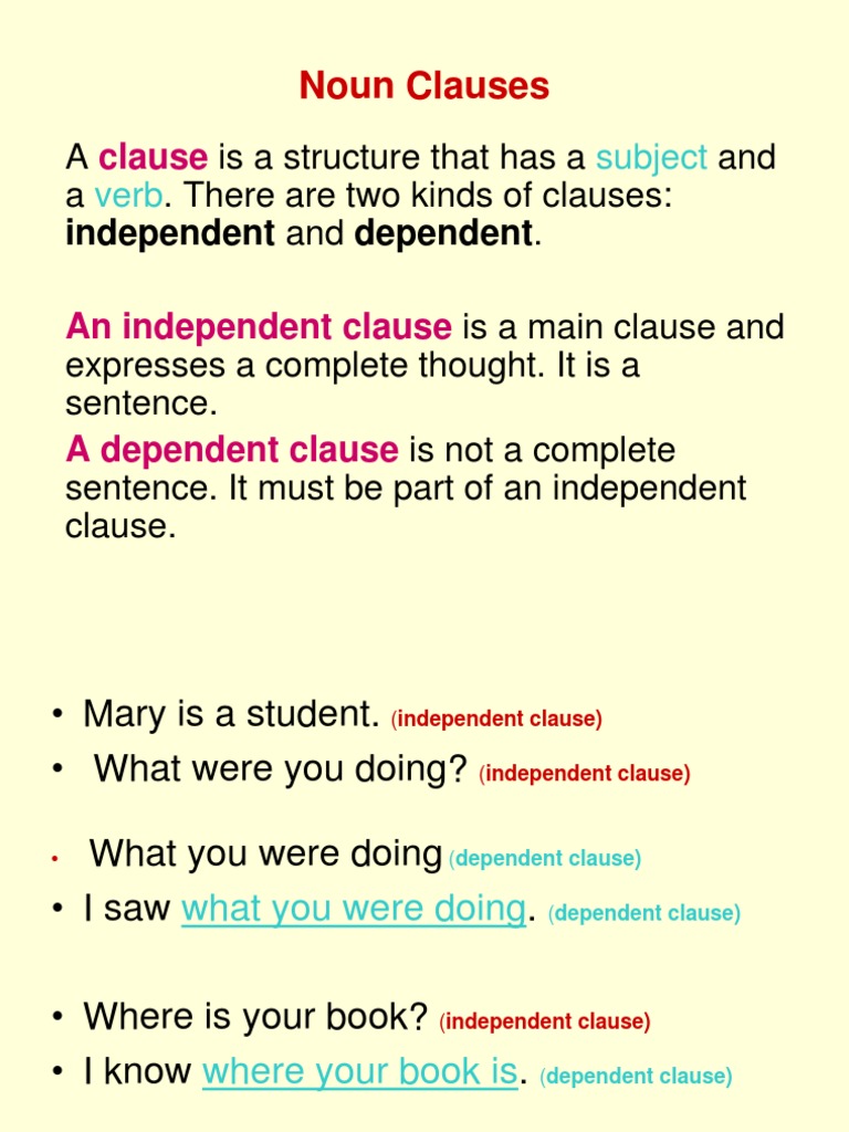 Main (or independent), subordinate (or dependent), adjective (or relative), and noun. As you know, a clause contains a subject and a predicate of its own. A content clause, also known as a noun clause, provides content implied or commented upon by its main clause. A noun phrase, or nominal (phrase), is a phrase that has a noun (or indefinite pronoun) as its head or performs the same grammatical function as a noun. The noun clause acts as the object of the preposition.